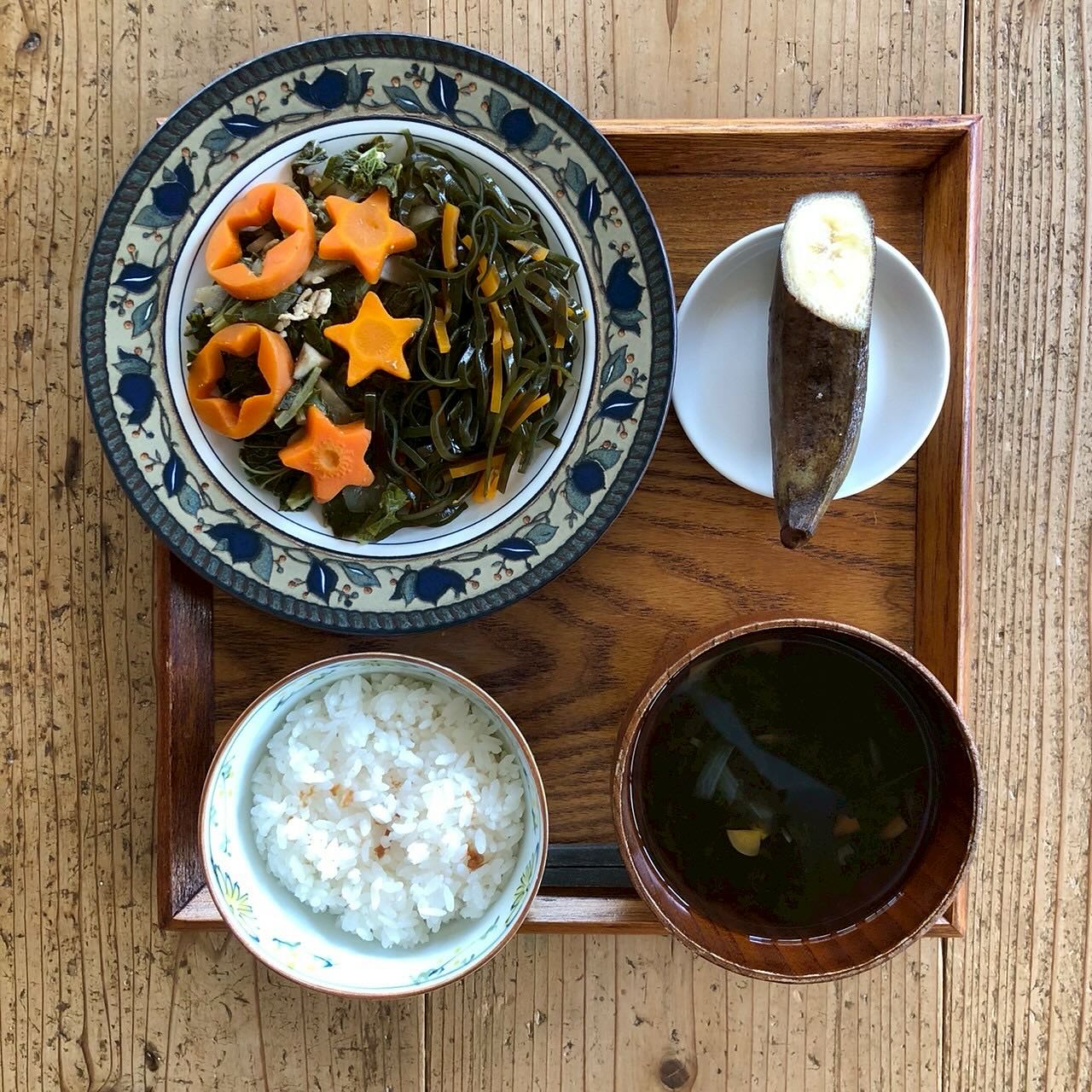 献立:ごはん、汁物、主菜(旬の野菜)、副菜の4品です。
